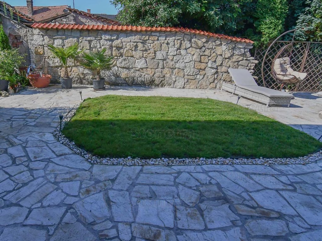 The stone is irregular in shape. It is suitable for exterior cladding of facades, walls, fireplaces, or as paving for terraces, walkways around the house, and parking spaces.