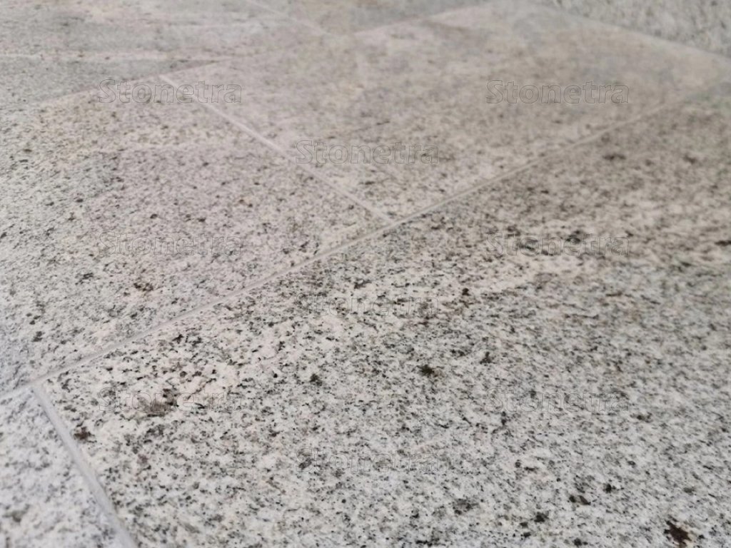Beautiful polished granite paving tiles in Frost White, in the size of 61 cm x 30.5 cm and 1 cm thick, stand out for their simplicity. It can also be used as stone cladding in bathrooms, kitchens, or office spaces. It plays its role in both classic and modern spaces. It retains its visible pattern thanks to the cutting process, which makes this type of stone unique.