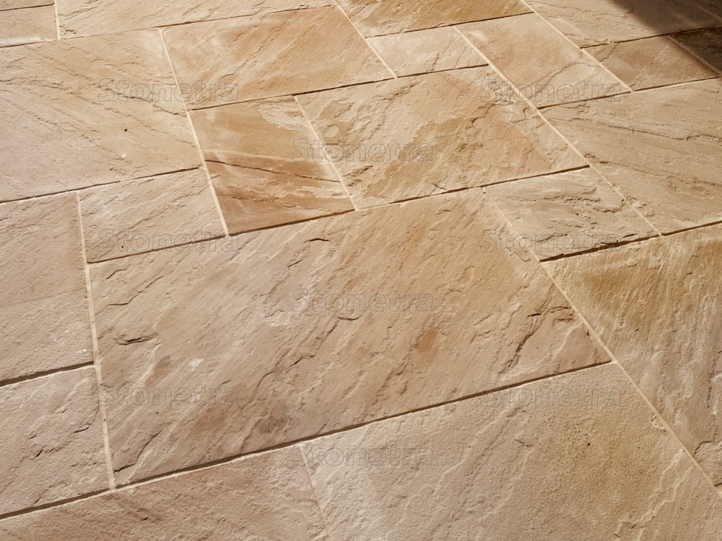 Outdoor stone paving calibrated to a thickness of 2.2 cm. This type of quartz sandstone is a very durable material and has a natural, rough, non-slip surface, and chiseled edges.