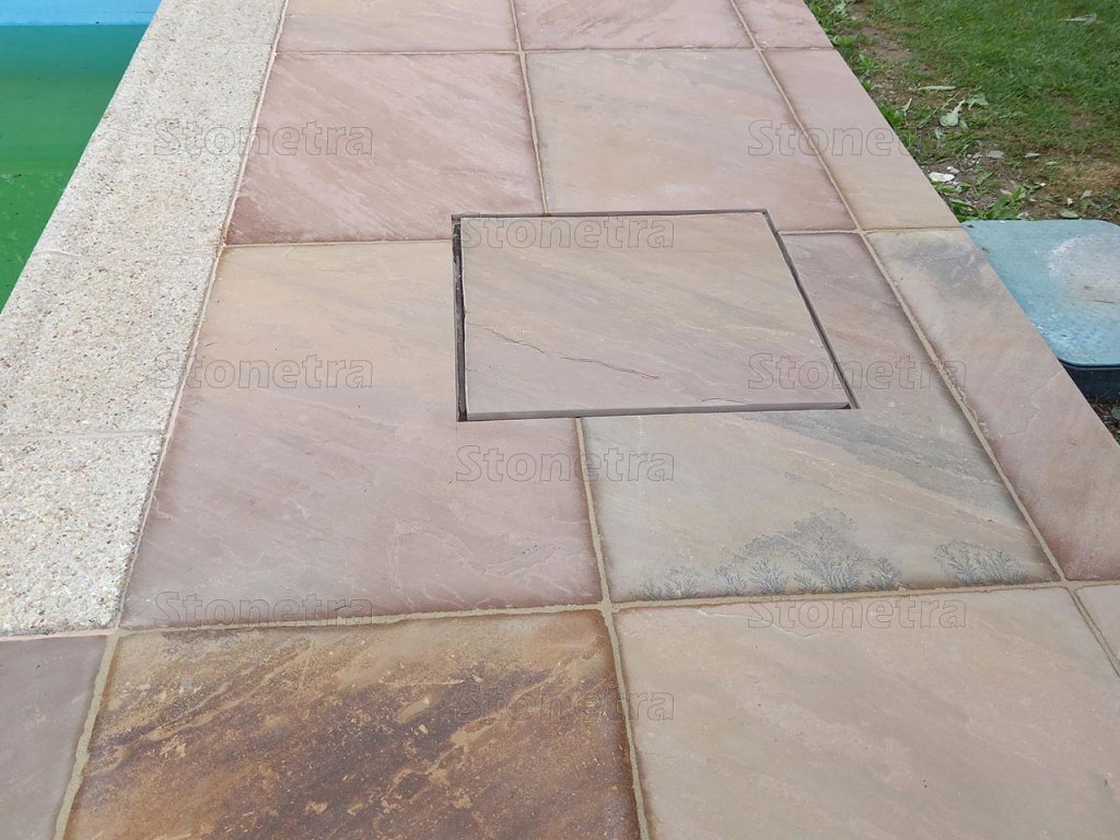 Outdoor stone paver calibrated to a thickness of 2.2 cm. This type of quartz sandstone is a very durable material. The paving sizes up to 90x60 cm, has a natural, rough, non-slip surface, and chiseled edges.