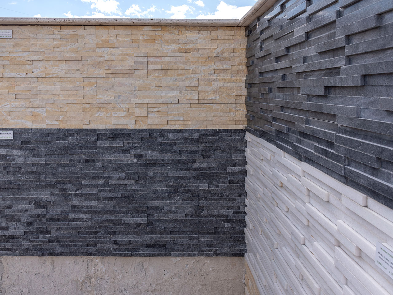Explore our exterior showroom to see how stone performs outdoors – from facades and walls to terraces and fences. Large panels reveal the true texture, color, and finish of each stone in natural light.