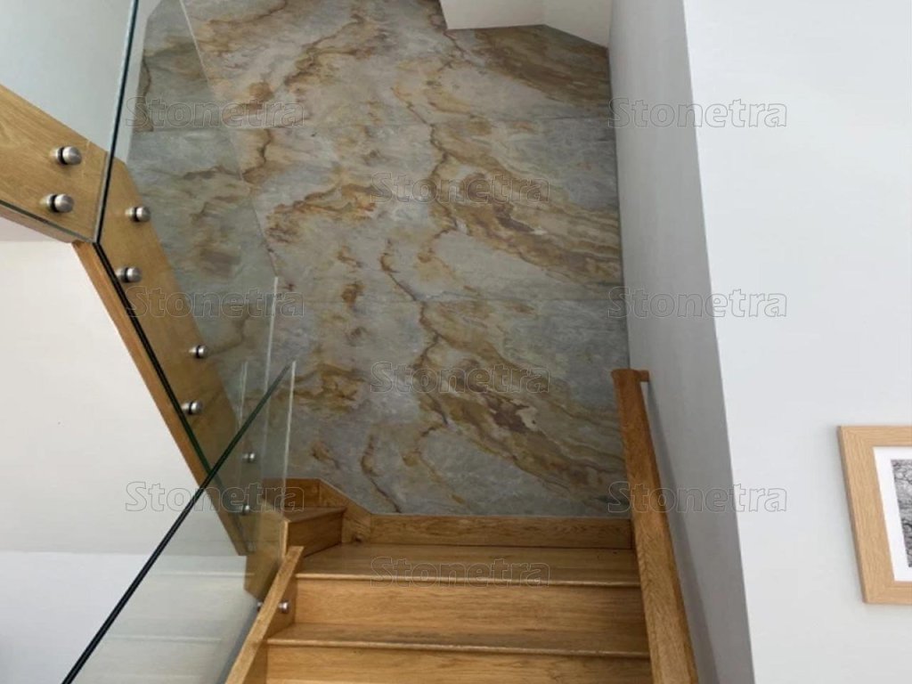Indian Autumn stone veneer provides a universal solution for both interiors and exteriors. It is an excellent choice for kitchen, living room, or bathroom cladding. This stone veneer has an interesting feature – when backlit with light or LEDs, it slightly transmits light, creating a subtle transparent effect that highlights its texture and gives the space a unique, sophisticated look.