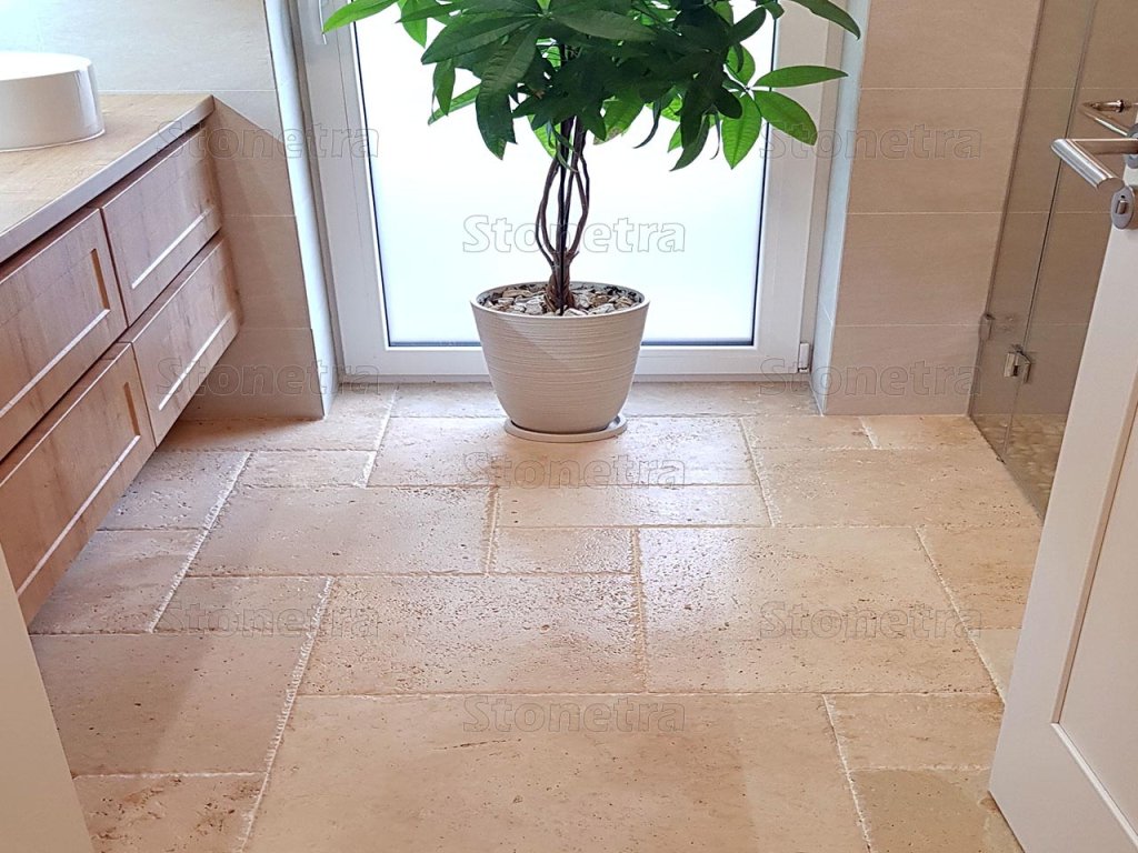 The stone can be used in all interior spaces – living rooms, bedrooms, bathrooms, halls, staircases, offices, or administrative buildings. The tiles are unfilled and have chiseled edges, which gives them a rustic and very elegant look. Since travertine is a porous natural stone, gray adhesive could seep through and change the color of the stone, so we recommend using white adhesive for tiles and paving. The French pattern is laid according to a scheme of 4 different tile formats. A complete pattern consists of two sets, with one set covering an area of 0.74 m2.