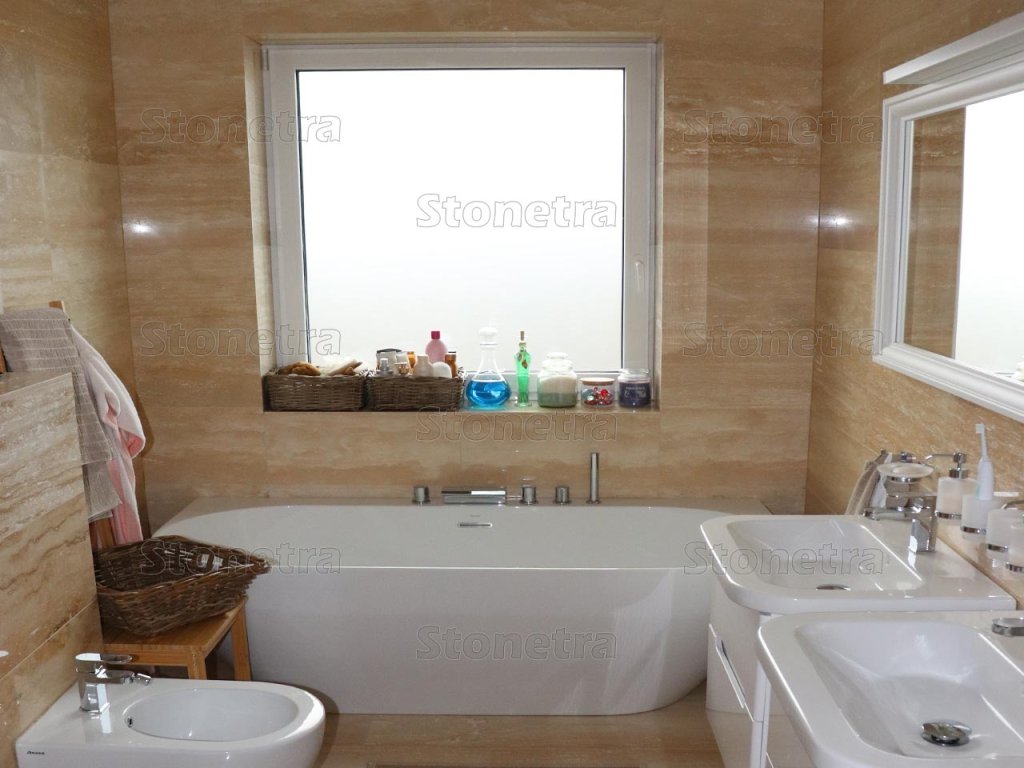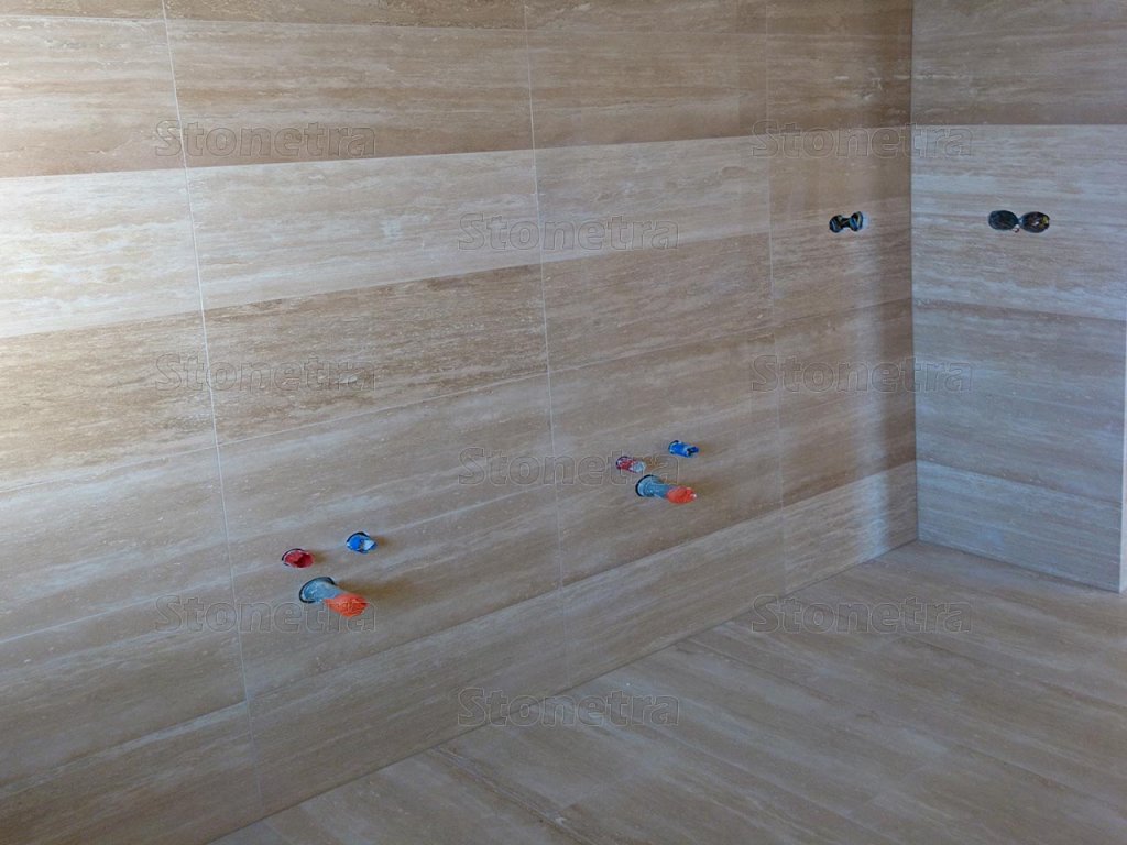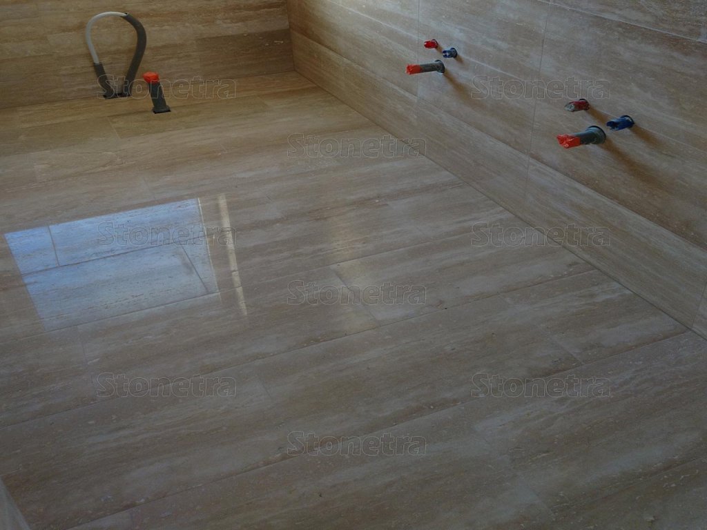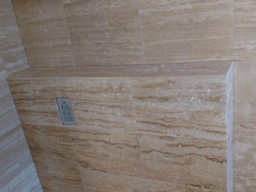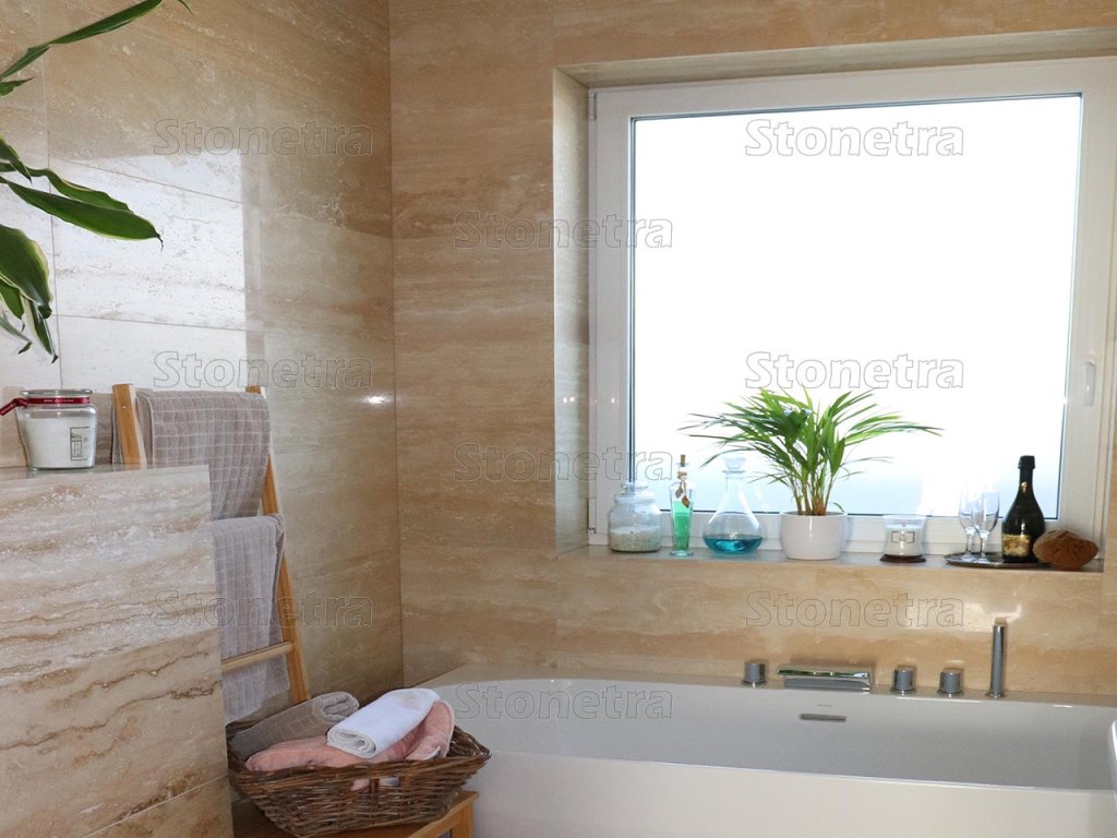 Surface finish - smooth to the touch, polished, classic color - beige with a subtle brownish pattern, which is very popular and combines well with other materials. The cutting direction is veincut - longitudinal grain, which creates a wavy, accentuated pattern in the stone. Travertine is most often used indoors as wall cladding or flooring in bathrooms, kitchens, entrance halls, hallways, living rooms, bedrooms, or its beauty also stands out in commercial spaces, salons, and offices.