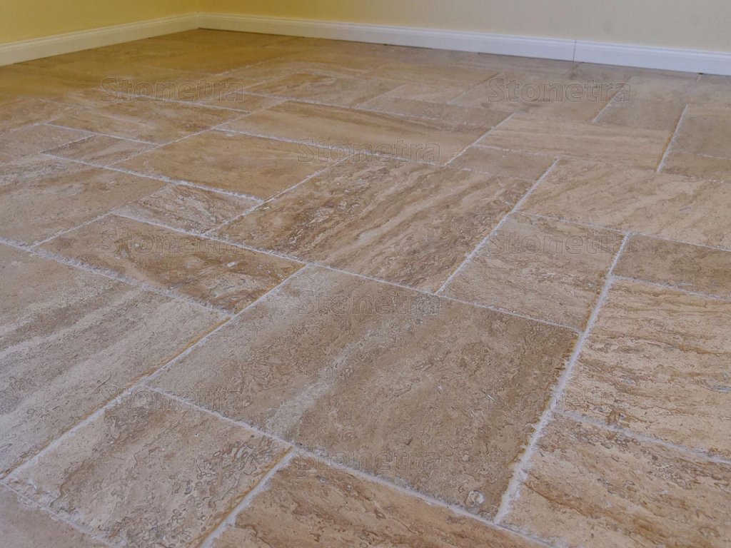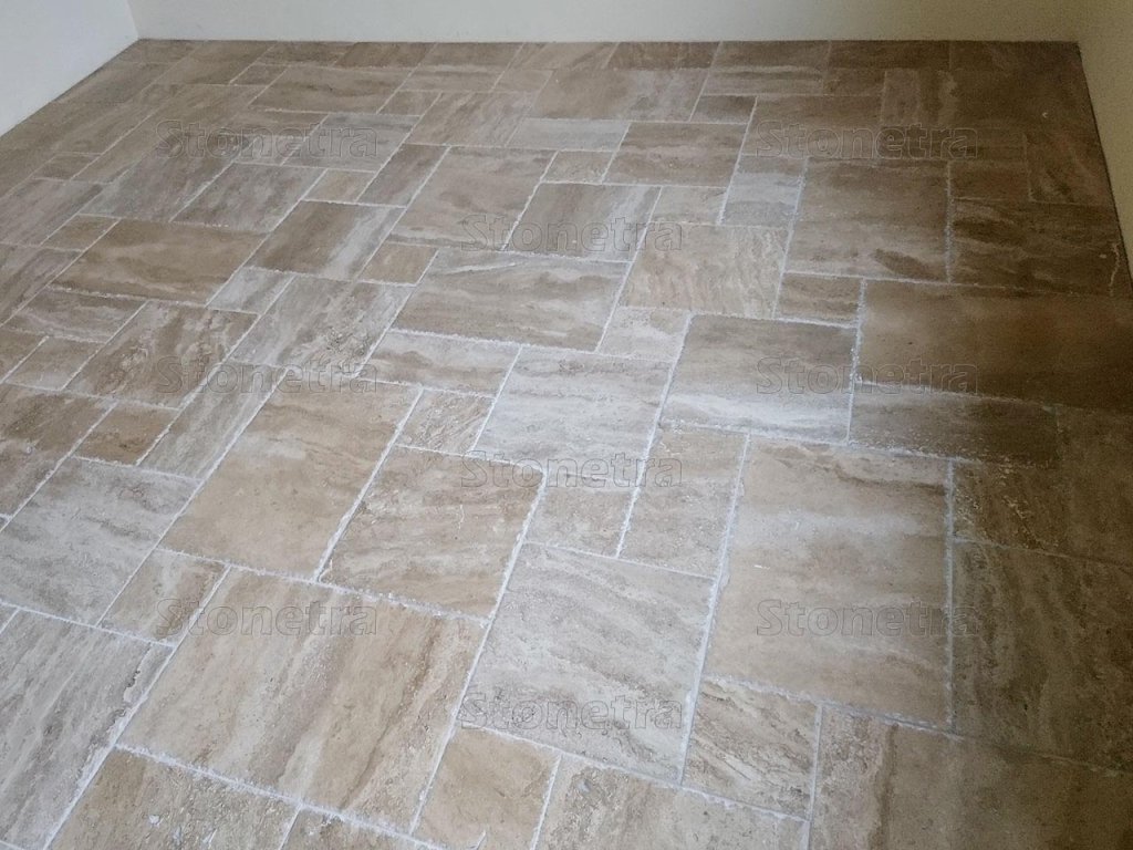 The tiles are unfilled and have chiseled edges, giving them a rustic and very elegant look. Ideal for interior flooring or as decorative wall tiles. Stone floors are easy to maintain, requiring only regular dusting. Travertine adds softness and elegance to interiors thanks to its warm pastel shades. The French pattern is laid according to a scheme of 4 different tile formats. A complete pattern consists of two sets, with one set covering an area of 0.74 m2.