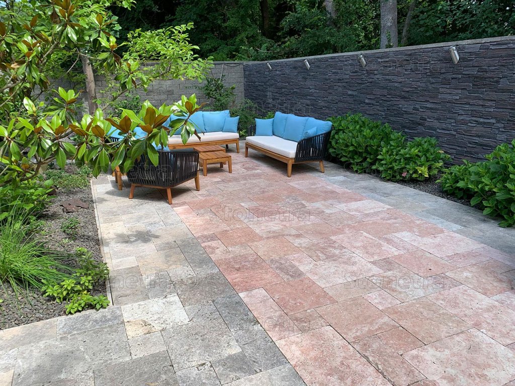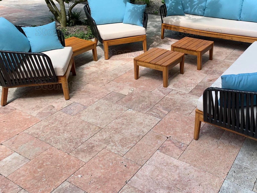 The tile is unfilled and has chiseled edges, which looks rustic and very elegant. It is suitable for outdoor use or we also offer tiles in a thinner version of 1.2 cm suitable for indoor use. Travertine is resistant to heat, frost and moisture, at the same time vapor-permeable and has a natural anti-slip surface. The French pattern is laid according to a scheme of 4 different tile formats. One complete "pattern" is made up of two sets, with one set having an area of 0.74 m².