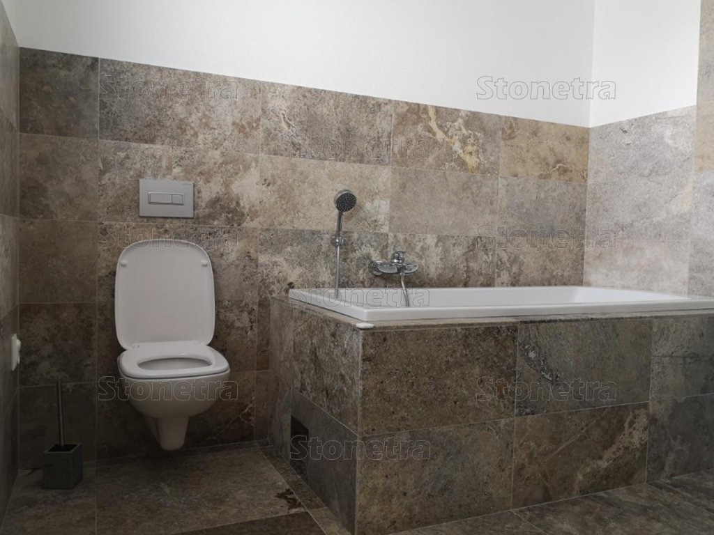 Large-format tiles are suitable for large rooms without partitions or smaller spaces, as they visually unify the floor area. In interiors, the possibilities for wall or floor tiling are virtually unlimited. Travertine cladding stone is becoming a trend and is used primarily as a decorative element, whether in commercial spaces or to make your home more cozy. Stone cladding/paving in this format can be used in living rooms, hallways, bathrooms, kitchens, or in office or commercial spaces.