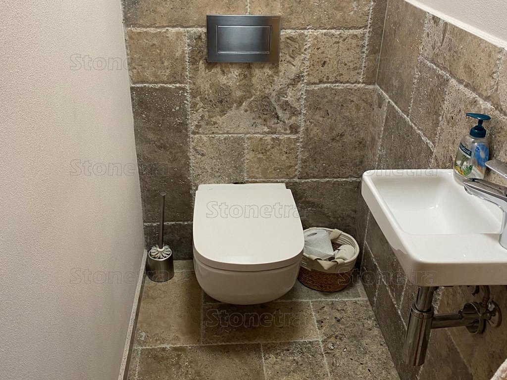 The French pattern consists of 4 different sizes interconnected so as not to create straight joints. One set contains a total of 6 pieces of tiles (0.74m2), while the overall pattern, which can be endlessly repeated, is created from two sets laid according to a specific scheme. The tiles are unfilled and have chiseled edges, which looks rustic and very elegant. Ideal for interior tiles or as wall cladding. After a single impregnation, it perfectly repels and does not absorb water and other liquids, it can be used in the bathroom without any worries.